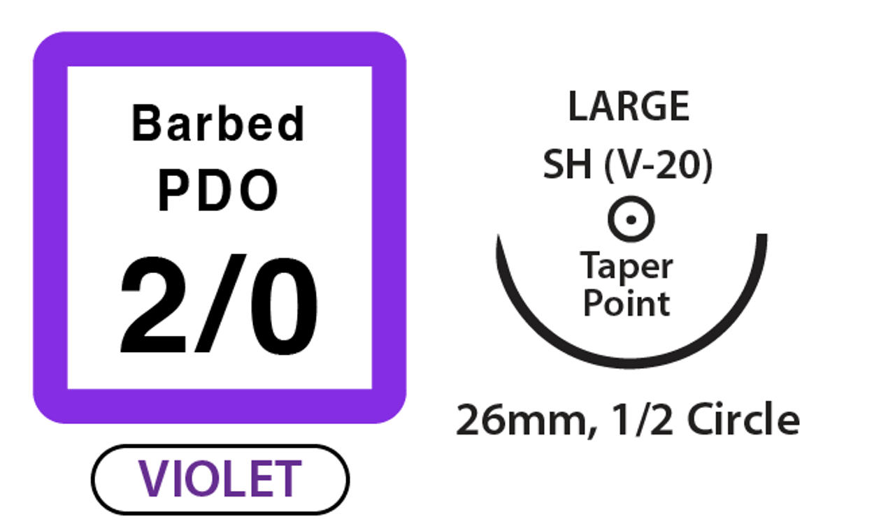 Product Name: Barbed PDO Surgical Suture, Size 2/0, 18" Thread with 26mm 1/2 Circle Taper Point Needle. Violet. Box of 6.