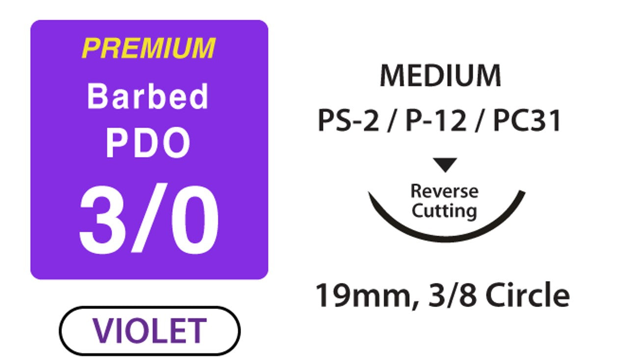 Product Name: Barbed PDO Surgical Suture, Size 3/0, 12" Thread with 19mm 3/8 Circle, Reverse Cut Needle. Violet. Box of 6.