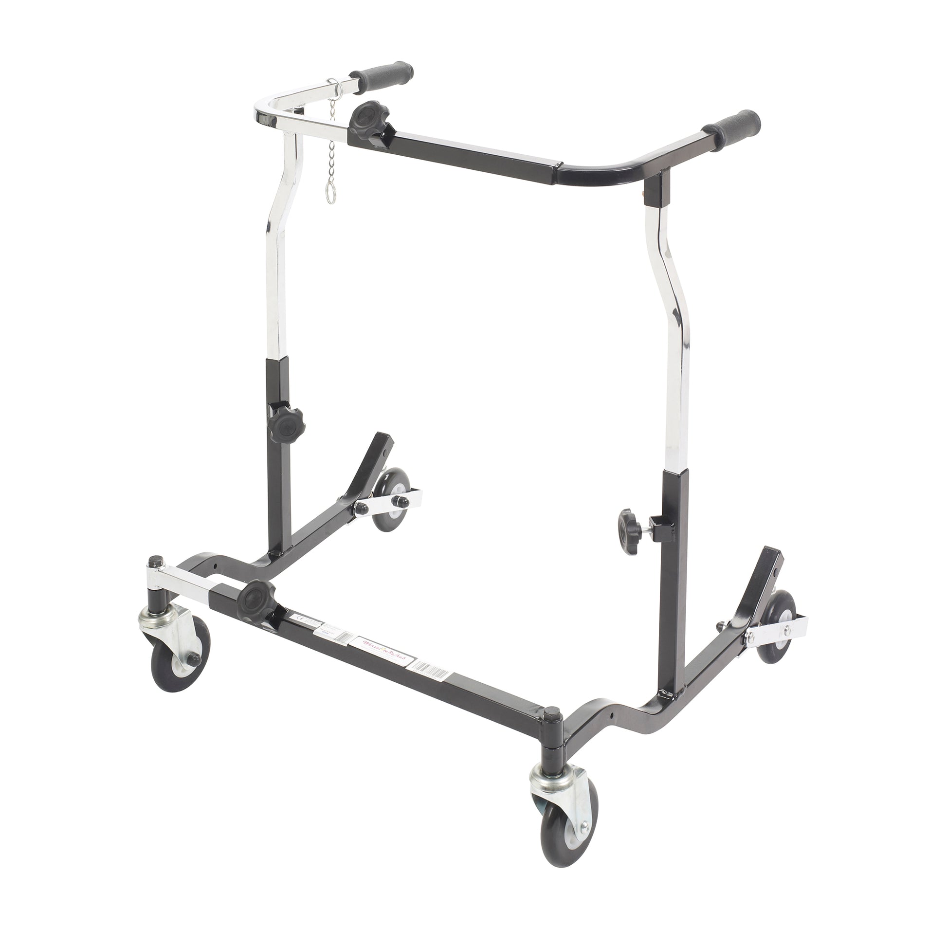 The Bariatric Anterior Safety Roller from Wenzelite features sturdy construction and a functional design to give adult users confidence as it encourages safe ambulation and a sense of freedom. The unit's adjustments and modular components allow it to be tailored to the specific user. Simple pressure to the Roller's handlebars activates the secure braking mechanism, preventing the wheels from rolling, which is ideal for users with limited hand function or limited cognizance. The Roller also halts in step with the user and the brake automatically engages should the user stumble.Welded steel frame|Height adjustable in 1" increments|Width adjustable|Adjustable-brake spring tension|Patient is situated in the center of the Safety Roller, which provides maximum support and improved posture|Skid-resistant, non-marring, easy-rolling neoprene wheels|Ideal for indoor and outdoor use|Folds easily and stands on its own in the folded positionActual Product Weight: 19 lbs; Base Depth: 25"; Base Width: 22.5"-27.5"; Handle Height (Max): 36"; Handle Height (Min): 29"; Inside Hand Grip Width: 17.5"-22.5"; Number of Wheels: 4; Overall Product Height: 29"; Overall Product Length: 25"; Overall Product Width: 22.5"; Primary Product Color: Silver Vein; Primary Product Material: Steel; Product Weight Capacity: 500 lbsOption: Heavy Duty 500lbsThe Bariatric Anterior Safety Roller from Wenzelite features sturdy construction and a functional design to give adult users confidence as it encourages safe ambulation and a sense of freedom. The unit'sadjustments and modular components allow it to be tailored to the specific user. Simple pressure to the Roller's handlebars activates the secure braking mechanism, preventing the wheels from rolling, which is ideal for users with limited hand function or limited cognizance. The Roller also halts in step with the user and the brake automatically engages should the user stumble. Available with 500 lbs or 1000 lbs weight capacity.Welded steel frame|Height adjustable in 1" increments|Width adjustable|Adjustable-brake spring tension|Patient is situated in the center of the Safety Roller, which provides maximum support and improved posture|Skid-resistant, non-marring, easy-rolling neoprene wheels|Ideal for indoor and outdoor use|Folds easily and stands on its own in the folded position|Available with 500 lbs or 1000 lbs weight capacity