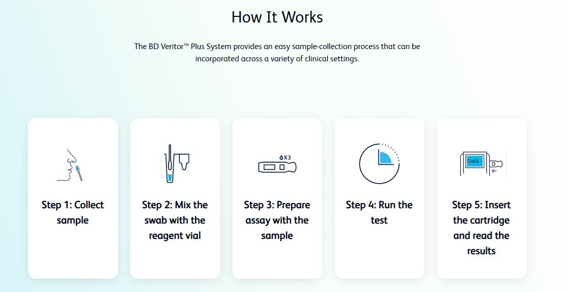 *EUA Information for the BD Veritor™ SARS-CoV-2 and SARS-CoV-2 & Flu A+B assays: These products have not been FDA cleared or approved; but have been authorized by FDA under EUA for use by authorized laboratories. The BD Veritor™ System for Rapid Detection of SARS-CoV-2 has been authorized only for the detection of proteins from SARS-CoV-2, not for any other viruses or pathogens; the BD Veritor™ System for Rapid Detection of SARS-CoV-2 & Flu A+B has been authorized only for the detection of proteins from SARS-CoV-2, influenza A and influenza B, not for any other viruses or pathogens; and, the emergency use of these products is only authorized for the duration of the declaration that circumstances exist justifying the authorization of emergency use of in vitro diagnostics for detection and/or diagnosis of COVID-19 under Section 564(b)(1) of the Federal Food, Drug and Cosmetic Act, 21 U.S.C. § 360bbb-3(b)(1), unless the declaration is terminated or authorization is revoked sooner.