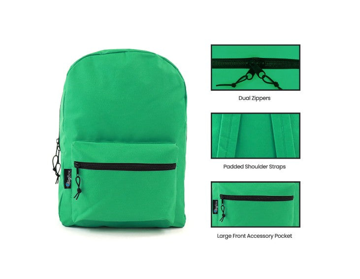 The BigBox basic backpack is perfect for school. This affordable backpack line features a large compartment for notebooks, binders, and folders. The expansive front pouch will keep pens and pencils within reach. The bags feature adjustable padded straps, sturdy zipper pulls, and reinforced seams. The 17" size is ideal for middle school kids who need a little more room for books and notebooks but is not too bulky.