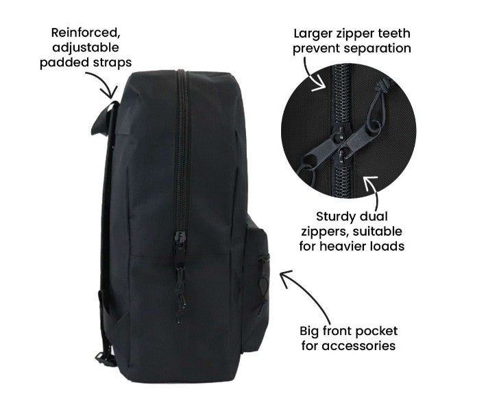BigBox basic backpacks features padded, reinforced straps for superior comfort and durability. The main compartment has an oversized zipper, allowing for hassle-free retrieval of notebooks, pencils, and other school supplies. The 15" size suits younger students or makes a compact option for students of all ages.