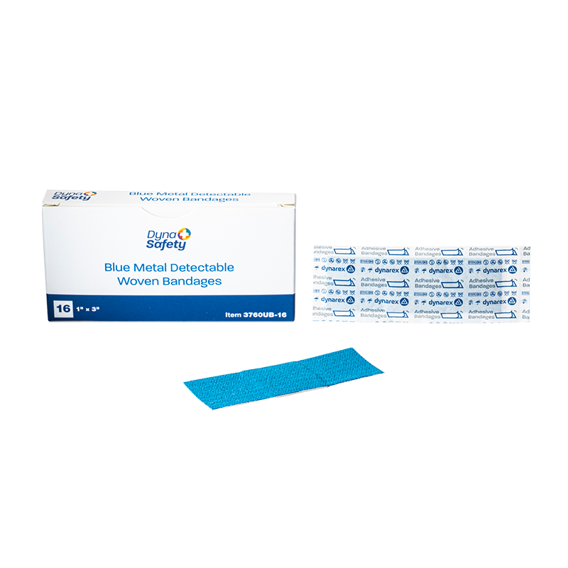 Dynarex DynaSafety Blue Metal Detectable Woven Bandages are premium-quality blue woven bandages designed for optimal visibility and improved safety. Ideal for use in a variety of professional environments, including food industry and pharmaceutical settings, these flexible fabric Bandages feature an internal foil strip for efficient metal detection. The Bandages are ventilated to help provide an optimal healing environment. .