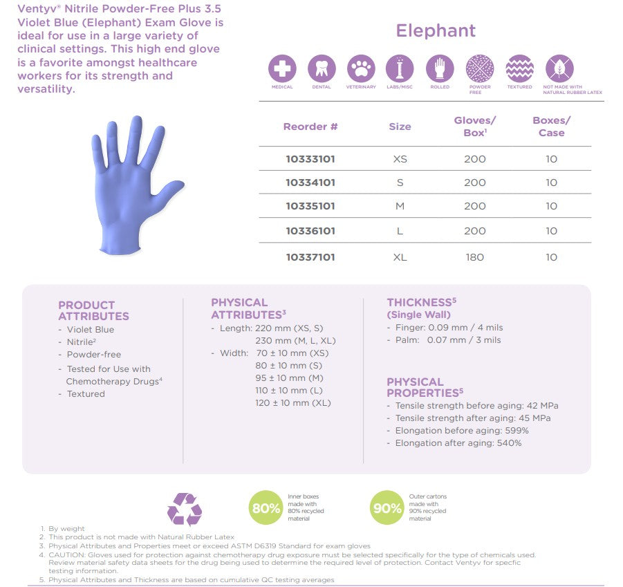 Ventyv Nitrile Powder-Free Plus 3.5 Violet Blue (Elephant) Exam Glove is ideal for use in a large variety of clinical settings. This high end glove is a favorite amongst healthcare workers for its strength and versatility.