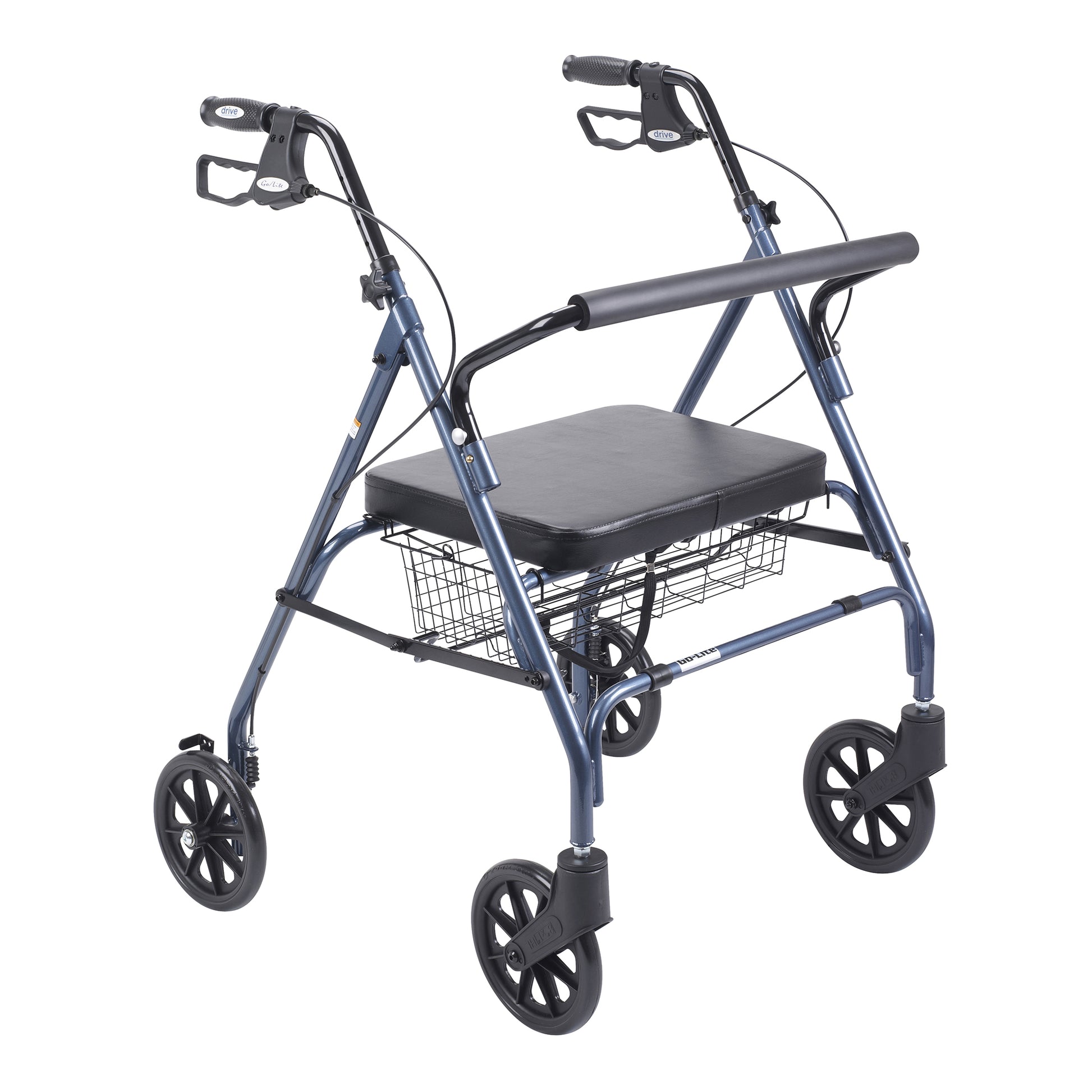 The Go-Lite Bariatric Rollator is constructed from a strong, steel-reinforced frame that supports up to 500 pounds. A padded oversized seat comes standard, and a large basket can be mounted underneath for easily and securely transporting personal items. The 8" casters are ideal for indoor and outdoor use, ensuring a smooth ride over most surfaces. The ergonomic hand grips with easy-to-use loop-lock handbrakes provide comfort and control. Simply push down on the handbrake to engage the parking brake feature.Special loop lock handbrake made of internal aluminum casting operates easily and ensures safety|8" casters with soft-grip tires are ideal for both indoor and outdoor use|Soft padded oversized seat offers a comfortable place to rest with a 500lb. weight capacity|Comes with a large 20.5"(W)x4.5"(H)x9"(D) basket that can be mounted under the seat to store personal items|Tool-free removable padded backrest provides extra comfort while seated|Handles can be easily adjustable to different heights with self-threading knobActual Product Weight: 26 lbs; Basket Height: 4.3"; Basket Length: 20.5"; Basket Width: 8.3"; Casters: 8"; Handle Height (Max): 39.5"; Handle Height (Min): 35.25"; Inside Hand Grip Width: 22"; Number of Wheels: 4; Overall Product Height: 35.25"; Overall Product Length: 26.75"; Overall Product Width: 30.5"; Primary Product Color: Blue; Primary Product Material: Aluminum; Product Weight Capacity: 500 lbs; Seat Depth: 13"; Seat Width: 18"; Seat to Floor Height: 22"; Width Inside Back Legs: 22.6"Color: BlueThe Go-Lite Bariatric Rollator by Drive Medical comes in an attractive red or blue finish. It is constructed from a strong, steel reinforced frame that supports 500 pounds and comes standard with a large, comfortable, soft padded, oversized seat with a large basket that is mounted underneath. The basket easily and securely transports personal items. The large, 8" caster wheels are ideal for indoor and outdoor use ensuring a smooth ride over most surfaces.Large 8" casters are ideal for indoor and outdoor use|Comes with large 21" (W) x 9" (D) x 6" (H) basket that can be mounted under seat|Tool Free removable padded back rest for comfort|Strong Steel reinforced frame supports 500 pounds|Soft padded oversized seat|Special loop lock made of internal aluminum casting operates easily and ensures safety|Handles are adjustable in height