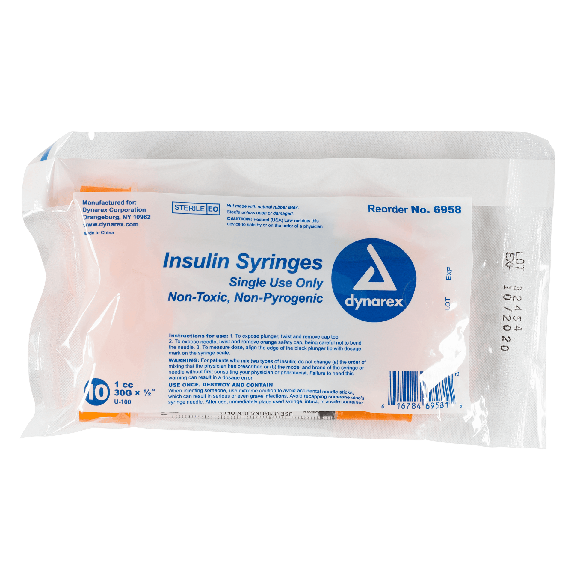 Insulin Syringe - Non-Toxic, 30G, 1/2" Needle, 1 cc, 5/100/cs