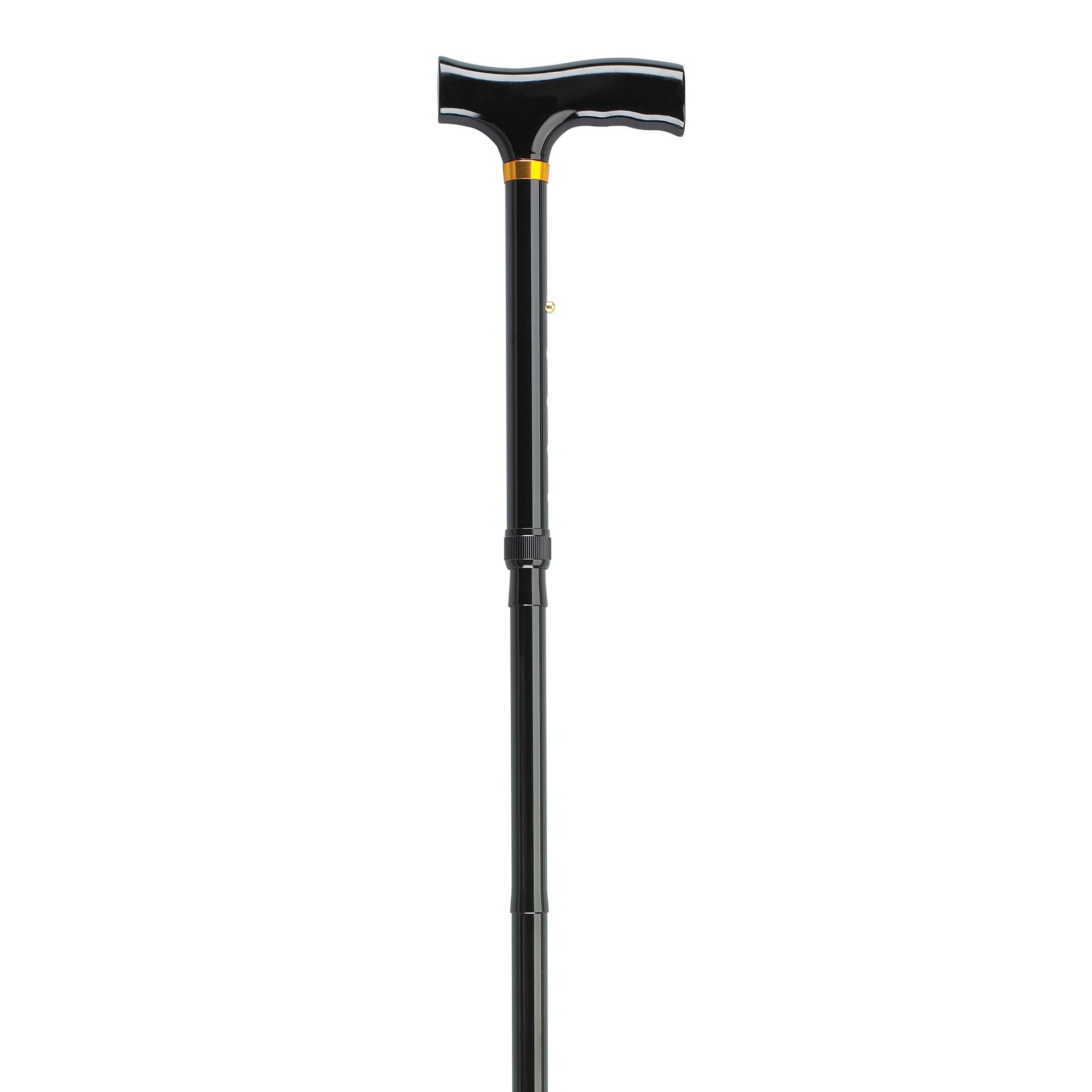 This lightweight adjustable aluminum folding cane with T Handle by Drive Medical is great for individuals on the go. The cane easily folds and unfolds with out tools, making storage or travel convenient. As an added bonus this cane comes with a handy carry holster which keeps the cane folded when not in use. The handle height adjusts in 1" increments from 33" to 37" allowing for personal sizing. Available in a great designer color this cane provides style and quality all in one. The premium grade wood handle is contoured to increase hand comfort and provide safety. This cane includes a plastic carry case.Cane folds into four convenient parts for easy storage|Attractive wood handle with brass collar|Manufactured with sturdy, extruded aluminum tubing|Comes with plastic clip to hang cane when folded|Handle height adjusts from 33" to 37"|300 lb Weight CapacityActual Product Weight: 0.86 lbs; Diameter: 0.75"; Handle Height (Max): 37"; Handle Height (Min): 33"; Overall Product Height: 33"; Overall Product Length: 5"; Overall Product Width: 0.75"; Primary Product Color: Black; Primary Product Material: Aluminum; Product Weight Capacity: 300 lbsColor: BlackThis lightweight adjustable aluminum folding cane with T Handle by Drive Medical is great for individuals on the go. The cane easily folds and unfolds with out tools, making storage or travel convenient. As an added bonus this cane comes with a handy carry holster which keeps the cane folded when not in use. The handle height adjusts in 1" increments from 33" to 37" allowing for personal sizing. Available in 9 great colors this cane provides style and quality all in one. The premium grade wood handle is contoured to increase hand comfort and provide safety. This cane includes a plastic carry case.Cane folds into 4 convenient parts for easy storage|Handle height adjusts in 1" increments from 33" to 37"|Attractive wood handle with brass collar|Comes with plastic holster carry case