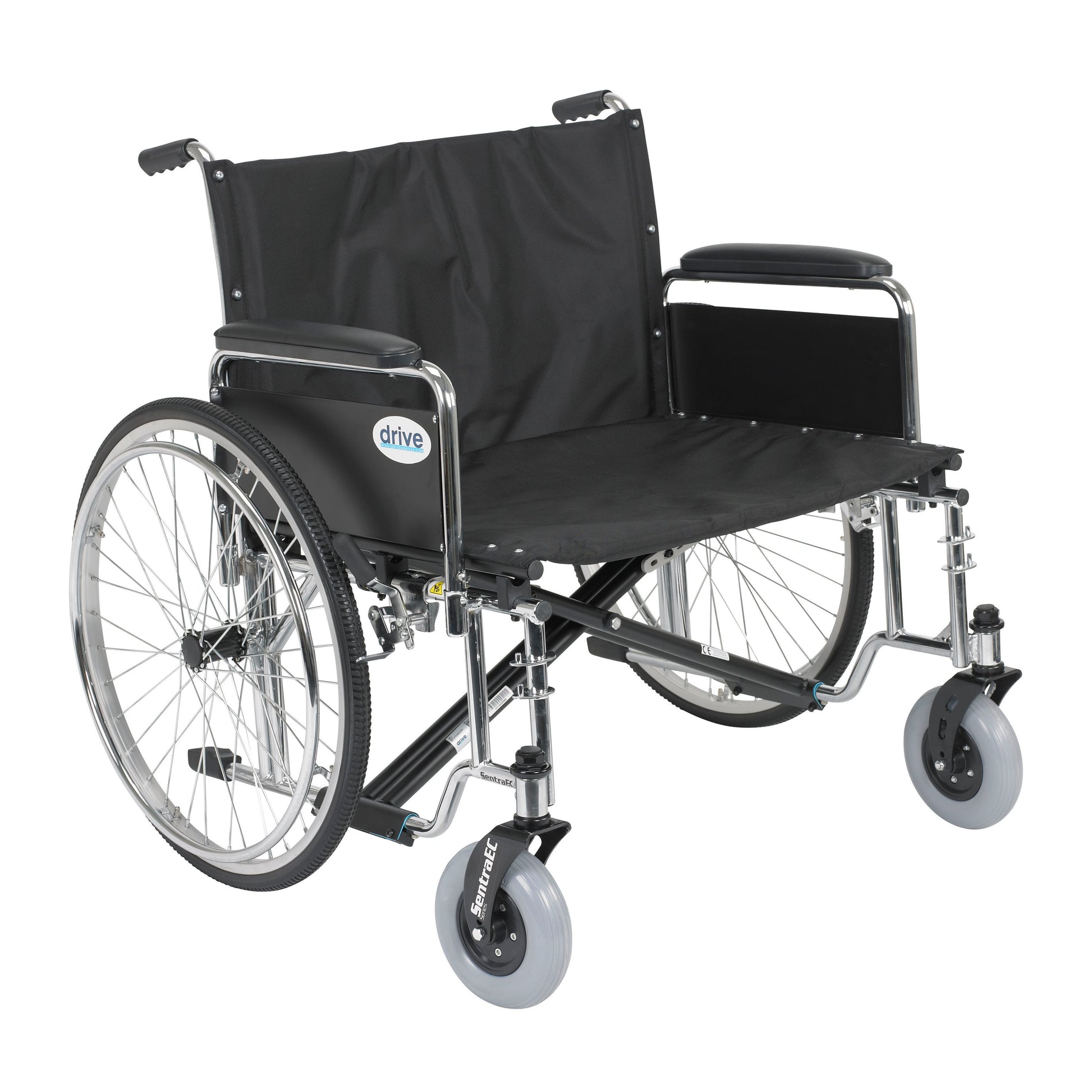 The Sentra EC Extra Wide Heavy Duty Wheelchair from Drive Medical boasts a 700 pound weight capacity, made possible through the use of reinforced steel gussets, reinforced nylon upholstery, reinforced side frame, extra heavy duty front forks and casters, and dual cross bars. The stylish triple chrome coated steel frame and steel spoke wheels add a touch of elegance to this bariatric wheelchair. This Sentra EC Extra Wide Heavy Duty Wheelchair comes with detachable full arms and a 30" wide seat. Foot rests are sold separately (Elevating Leg Rests - Drive Model # phelr, Swing Away Foot Rests - Drive Model # ph-sf).700 lb Weight Capacity|Carbon steel frame with triple-coated chrome for an attractive, chip-proof, maintainable finish|Reinforced steel gussets at all weight bearing points provide additional strength|Durable reinforced nylon upholstery|Steel spoke wheels are strong and maintenance free|Heavy-duty, flat-free 8" front casters are adjustable in two positions|Extra-heavy-duty front forks|Reinforced side frame, caster journals, and dual cross bars|Precision sealed wheel bearings in front and rear ensure long-lasting performance and reliability|Extra-large, padded armrests provide comfort and support|Riggings have extra-large, heavy-duty, aluminum foot plates that provide maximum support, are attractive and crack proof (Must be ordered separately)|Comes with push-to-lock wheel locksActual Product Weight: 69 lbs; Armrest Length: 14"; Armrest to Floor Height: 27.5"; Back of Chair Height: 18"; Brakes: Push-To-Lock Wheel Brakes; Casters: 8"; Closed Width: 15"; Folded Dimensions: 43" x 15" x 35"; Number of Wheels: 4; Overall Length w/ Riggings: 43"; Overall Product Height: 35"; Overall Product Length: 43"; Overall Product Width: 39"; Primary Product Color: Black; Primary Product Material: Steel; Product Weight Capacity: 700 lbs; Rear Wheels: 24" x 2"; Seat Depth: 20"; Seat Width: 30"; Seat to Armrest Height: 8"; Seat to Floor Height: 19.5"Option: Detachable Full Arms; Size: 30" SeatThe Sentra EC Extra Wide Heavy Duty Wheelchair from Drive Medical boasts a 700 pound weight capacity, made possible through the use of reinforced steel gussets, reinforced nylon upholstery, reinforced side frame, extra heavy duty front forks and casters, and dual cross bars. The stylish triple chrome coated steel frame and steel spoke wheels add a touch of elegance to this bariatric wheelchair. Available in various arm styles and seat widths, the right wheelchair exists for you.700 lb weight capacity|Carbon steel frame with TRIPLE coated chrome for an attractive, chip-proof, maintainable finish|Durable, reinforced nylon upholstery|Precision sealed wheel bearings in front and rear ensure long lasting performance and reliability|Reinforced steel gussets at all weight bearing points provide additional strength|Steel, spoke wheels are strong and maintenance free|Heavy duty, flat free 8" front casters are adjustable in 3 positions|Extra heavy duty front forks|Reinforce side frame, caster journals and dual cross bars|Extra large, padded armrests provide comfort and support|Extra large heavy duty, aluminum footplates provide maximum support, are attractive and crack proof (Must be ordered separately)|Comes with push to lock wheel lock