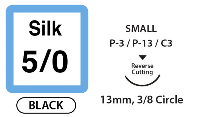 Product Name: Silk Surgical Sutures, Size 5/0, 18" Thread with 13mm 3/8 Circle R/C Needle. Black. Box of 12.