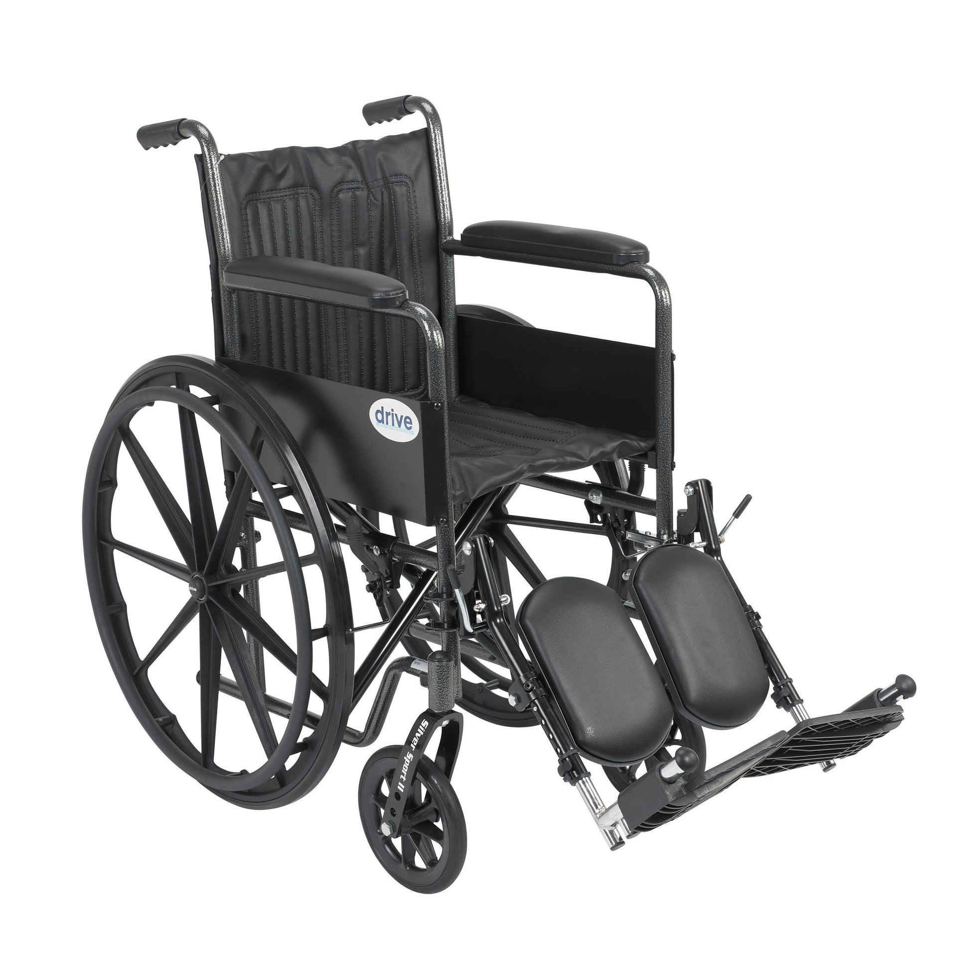 The 18" Silver Sport 2 Wheelchair with Fixed Arms and Swing Away Elevating Leg rests by Drive Medical comes in an attractive, easy to maintain, powder coated, silver vein finish, and a steel frame for durability. The urethane tires are mounted on composite wheels to provide durability and a smooth ride over most surfaces. The embossed, nylon upholstery is durable, lightweight, attractive and easy to clean. The carry pocket on the backrest provides an easy and safe way to transport personal items. Comes standard with swing away, elevating footrests, padded fixed arms, push to lock brakes and plastic footplates.Powder-coated silver vein steel frame|Embossed vinyl upholstery is durable, lightweight, attractive, and easy to clean|Urethane tires mounted on composite wheels provide durability and low maintenance|8" front casters adjustable in three positions|Padded armrests provide additional comfort|Carry pocket on backrest provides additional convenience|Comes with elevating leg rests with tool-free adjustable length riggings|Plastic foot plates with heel loops on footrests|Push-to-lock wheel locksActual Product Weight: 44 lbs; Armrest Length: 14"; Armrest to Floor Height: 27.5"; Back of Chair Height: 16"; Brakes: Push-To-Lock Wheel Brakes; Casters: 8"; Closed Width: 12.5"; Folded Dimensions: 42" x 12.5" x 36"; Number of Wheels: 4; Overall Length w/ Riggings: 42"; Overall Product Height: 36"; Overall Product Length: 42"; Overall Product Width: 26"; Primary Product Color: Black; Primary Product Material: Steel; Product Weight Capacity: 300 lbs; Rear Wheels: 24" x 1"; Seat Depth: 16"; Seat Width: 18"; Seat to Armrest Height: 8"; Seat to Floor Height: 17.5"-19.5"; Wheelchair Weight Without Riggings: 41 lbsOption: Non Removable Fixed Arms and Elevating Leg Rests; Size: 18" SeatThe Silver Sport 2 Wheelchair by Drive Medical, available in a variety of arm style and front riggings, comes in an attractive, easy to maintain, powder coated, silver vein finish, and a steel frame for durability. The urethane tires are mounted on composite wheels to provide durability and a smooth ride over most surfaces. The embossed, nylon upholstery is durable, lightweight, attractive and easy to clean. The carry pocket on the backrest provides an easy and safe way to transport personal items. Comes standard with padded fixed arms, push to lock brakes, and plastic footplates.Powder coated silver vein steel frame|Padded armrests|Embossed nylon upholstery is durable, lightweight, attractive, and easy to clean|Urethane tires mounted on composite wheel provides durability and low maintenance|Comes with push to lock brakes|8" front casters, adjustable in 3 positions|Carry pocket on backrest provides additional convenience|Comes with swing-away footrests or elevating leg rests with tool free length adjustable front riggings|Plastic footplates